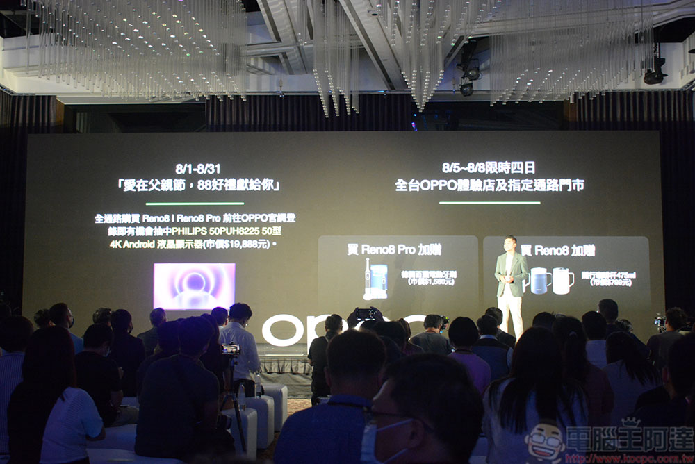 為迎接父親節到來,於 8/1 至 8/31 至全通路選購 Reno8 系列並完成官網登錄即有機會抽中 PHILIPS 50PUH8225 50 型 4K Android 液晶顯示器 (市值 19,888元)。另祭出「愛在父親節,88 好禮獻給你」,8/5 至 8/8 限時四日期間,凡於全台 OPPO 體驗店及指定通路門市選購 Reno8 Pro 及 Reno8 ,將分別加贈德國百靈電動牙刷(市價 1,580元)、隨行咖啡杯 475ml(市價799元),以超實用優惠好禮,向爸爸表達孝敬感謝心意!