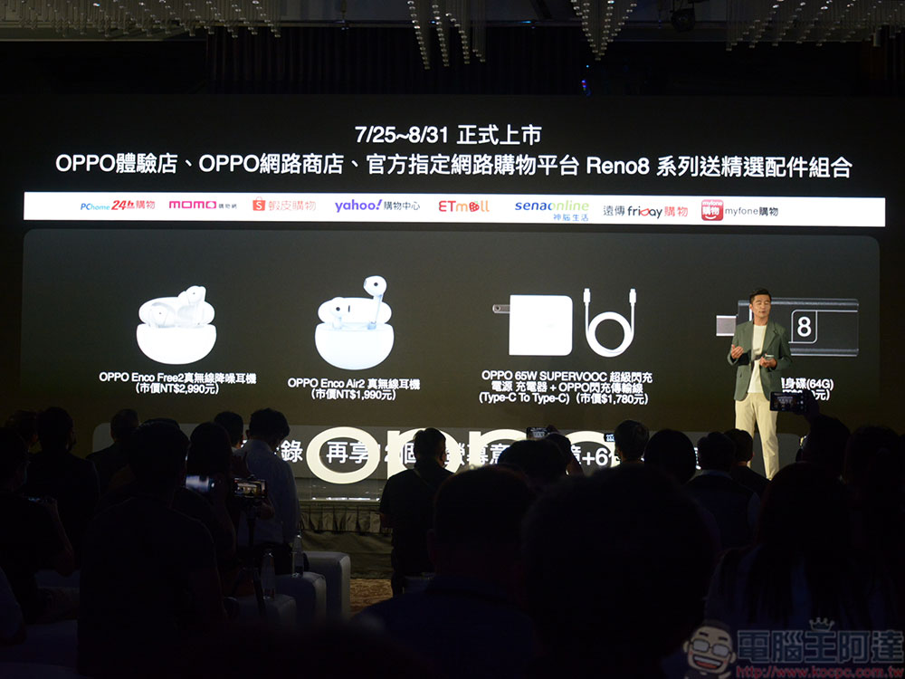 OPPO Reno8 系列即將於 7/25 正式上市,OPPO Reno8 售價為 15,990元、OPPO Reno8 Pro 售價為 24,990 元。首波開賣通路包含 OPPO 體驗店、OPPO 網路商店和官方指定網路購物平台(PChome 24h 購物、momo 購物網、蝦皮購物、yahoo 購物中心、ETMall 東森購物網、神腦生活、遠傳 friDay 購物、台灣大哥大 myfone 購物)。