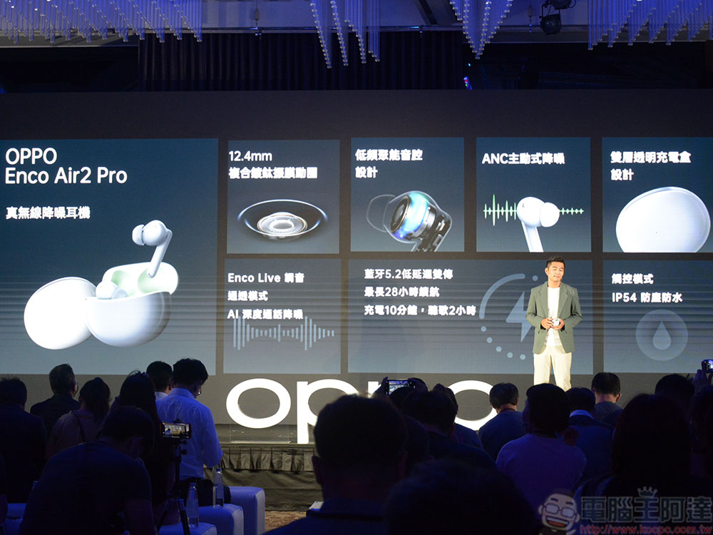 新一代 OPPO Enco Air2 Pro 真無線降噪耳機也在這次同步上市,Enco Air2 Pro 搭載市售入耳式耳機中最大尺寸的 12.4mm 複合鍍鈦振膜動圈,搭配低頻聚能音樂腔設計,打造震撼的立體低音音頻;支援全新 Enco Live 調音功能,為用戶提供多元風格的聆聽體驗,不論是節奏感強烈的搖滾音樂或是輕快抒情的流行歌曲,用戶都能享受頂級的聽覺饗宴。