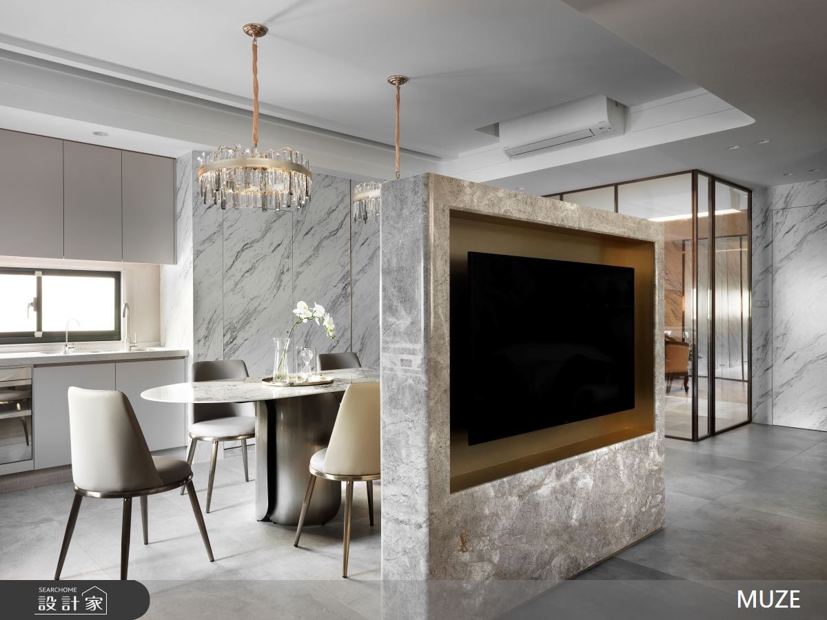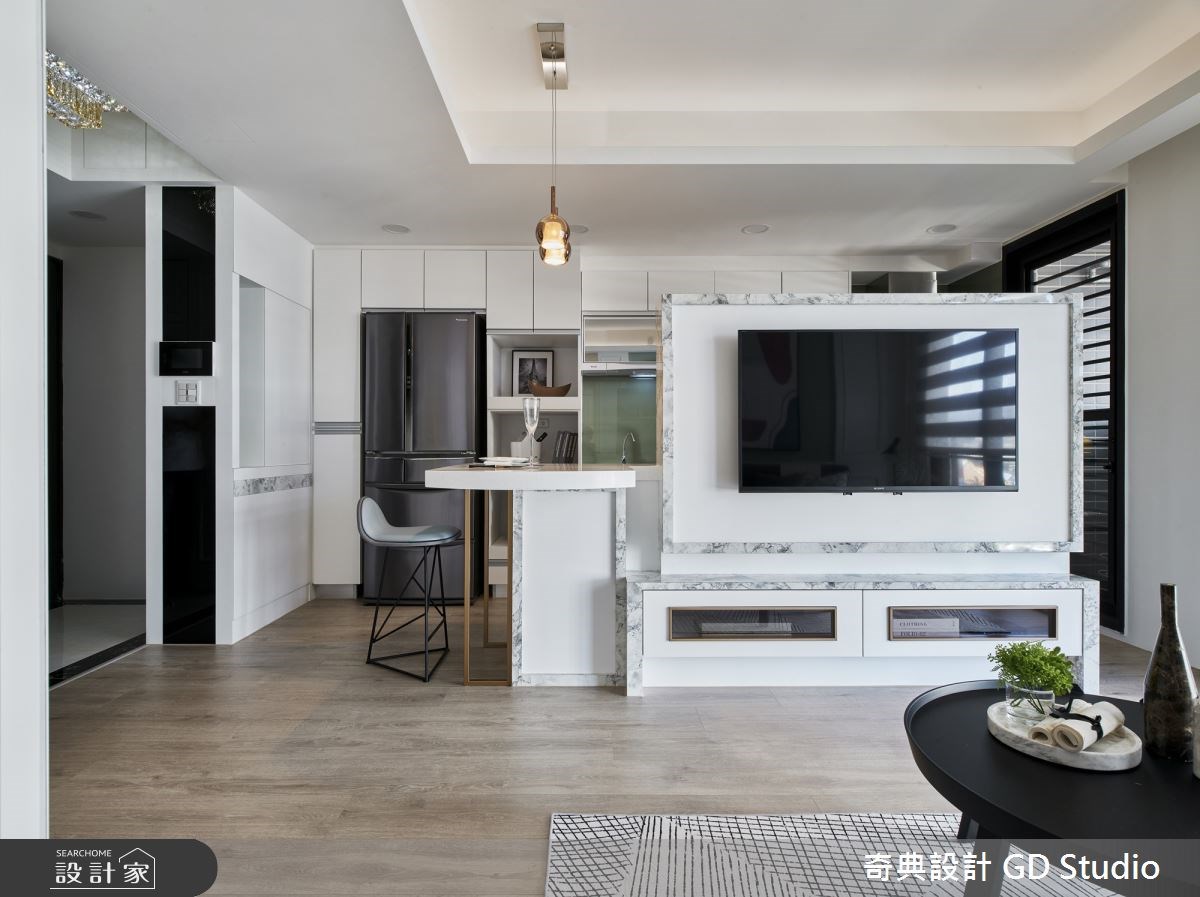 如果希望擁有大客廳,以及實現開放式餐廚的夢想,電視牆不一定要完全做滿,藉由半身高的高度和預留兩側走道,既能滿足客廳需要的獨立性,也能延伸公領域的視野和採光。