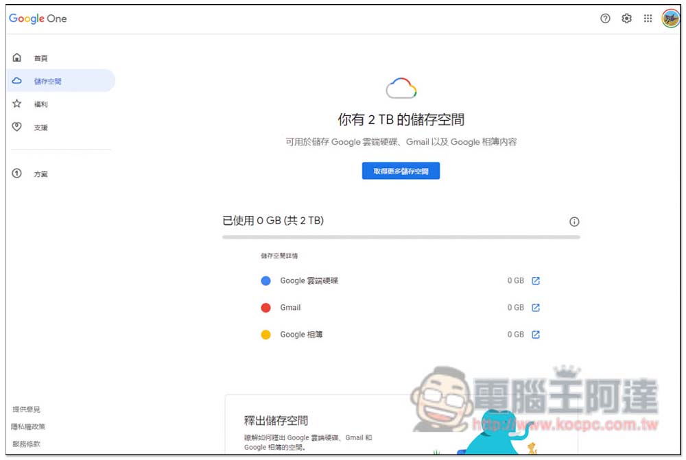 接下來就進入重頭戲,開始訂閱 Google One 方案!打開 Google 雲端硬碟頁面後,按左下方的 "購買儲存空間":