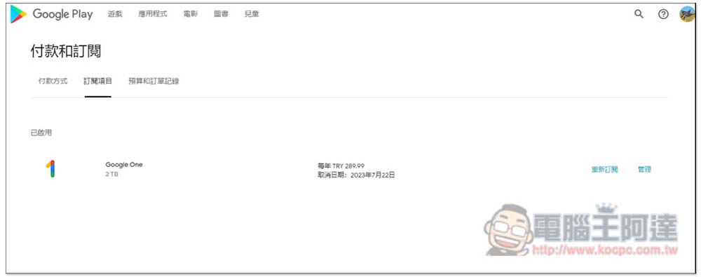 如何取消訂閱土耳其 Google One 方案?