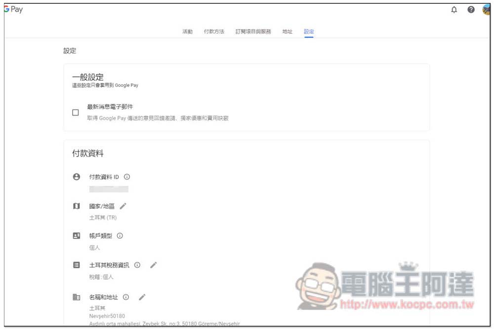設定頁面也會看到土耳其的付款資料: