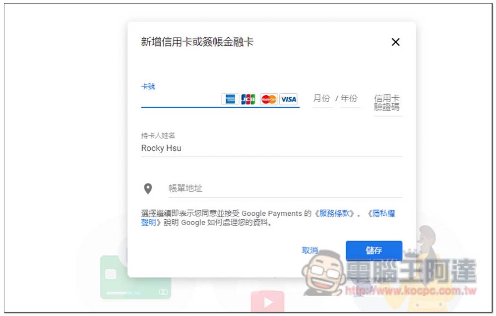 打開新增信用卡或簽帳金融卡畫面之後,建議先按一下帳單地址,把國家改成土耳其,然後在輸入上方的卡號、持卡人姓名以及帳單地址,可以輸入台灣信用卡: