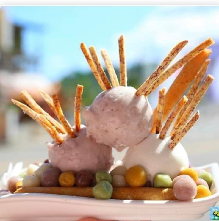 「江記舊記芋餅」位於甲仙區文化路上,有別於傳統的芋冰,店家將自製的芋頭餅和冰淇淋做結合,開發了視覺超繽紛的「草船借箭冰」,不過想吃的話必須要先打電話預訂,店裡也有提供傳統的芋冰和芋冰餅。
