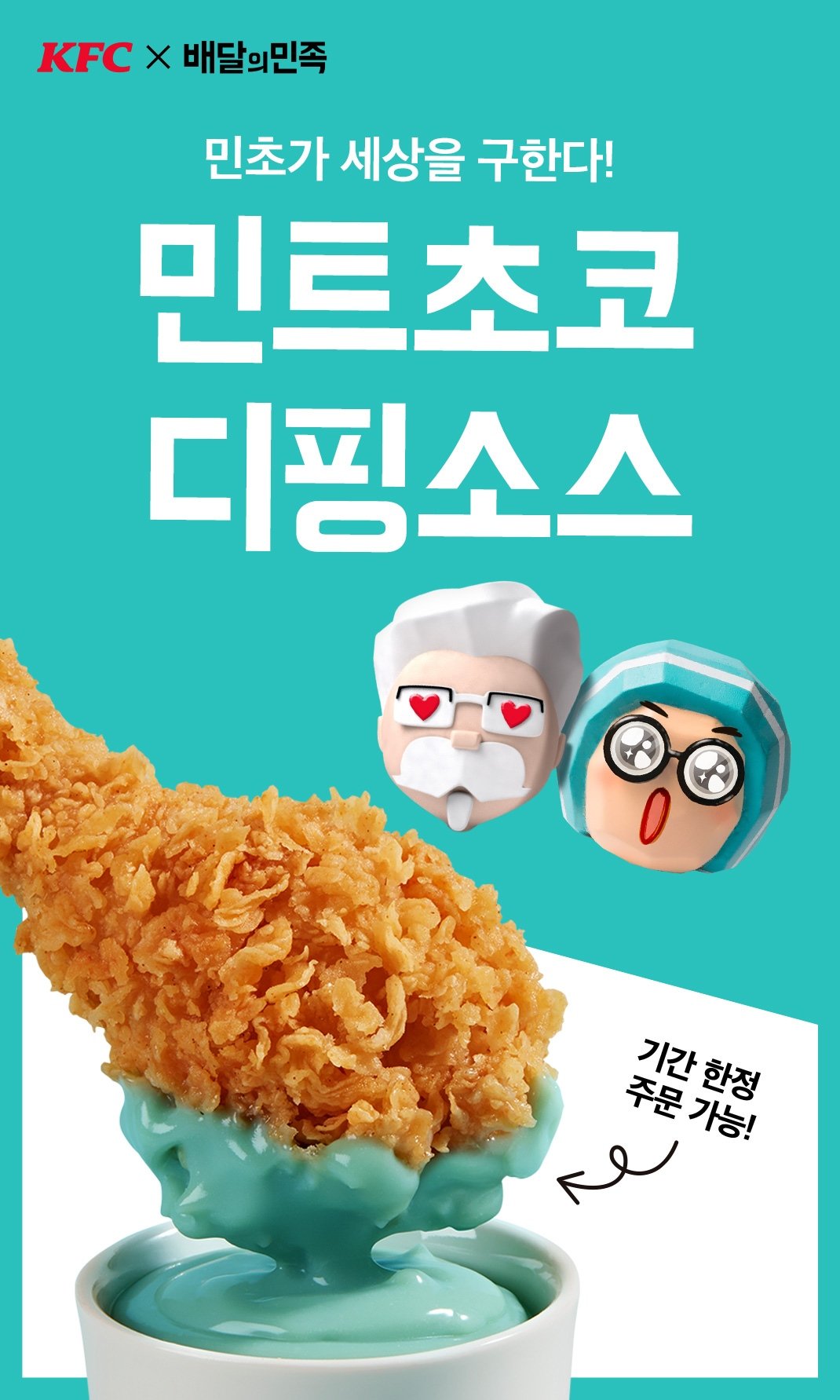 最近韓國肯德基和韓國本土外送APP「外賣的民族」聯名推出期間限定「薄荷巧克力炸雞」,超驚人的外貌引發不少話題,鹹鹹的炸雞沾上甜甜的薄荷巧克力醬,完全是難以想像的味道呀!