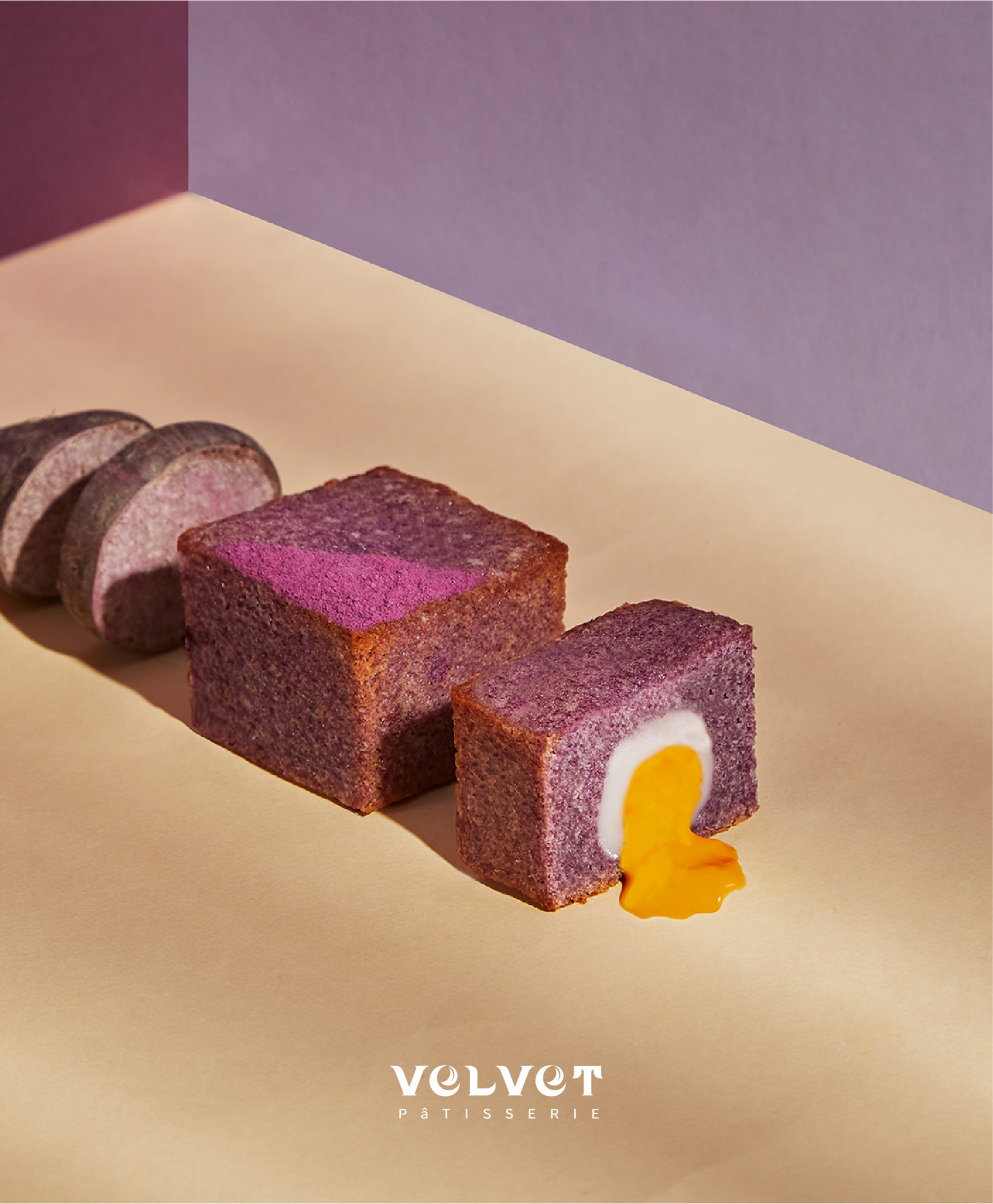 以磅蛋糕豐富的奶油含量與其扎實的口感為基底,紫薯粉揉合於棉密細緻蛋糕體中,有柔軟Q彈的麻糬揉入味蕾,緊接而來熔岩金沙流淌於口中,每一口都能是紫薯與金沙濃郁香氣。