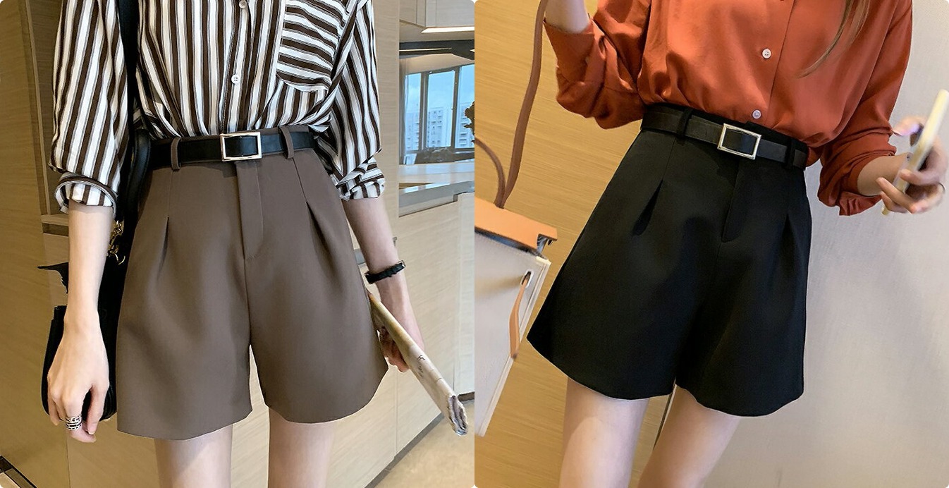 除了基本款的西裝短褲之外,想要在穿搭的時候更有時尚感,不妨可以選擇有設計感的單品。像是這件就以五金配件做裝飾,製作假腰帶的視覺效果,讓原本平淡無奇的西裝短褲瞬間質感升級。