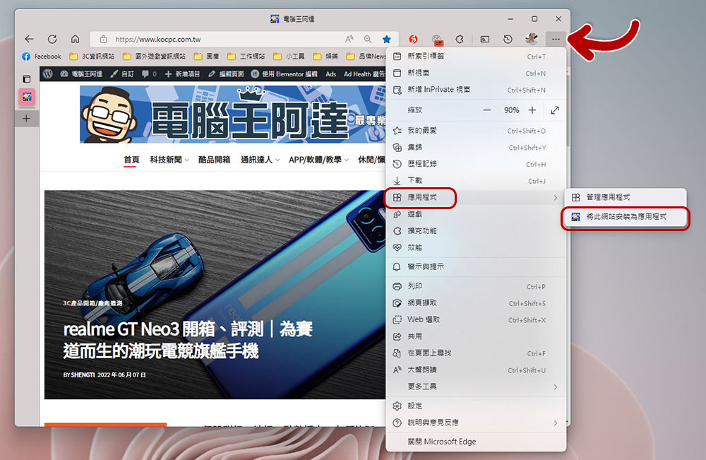 - 點擊 Microsoft Edge 瀏覽器右上角的三點選單,從「應用程式」這項中選擇「將此網站安裝為應用程式」。