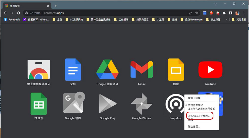 - 如果想要移除用 Chrome 製作的 WebApp,請前往「chrome://apps」(請複製引號內的網址貼到網址列前往),然後在想要移除的項目上點擊滑鼠右鍵,選擇「從 Chrome 中移除」即可。