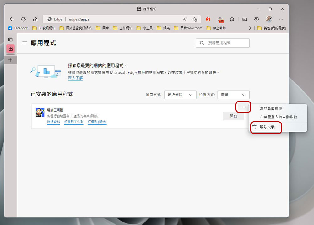 - 下次你取用時,只需點擊電腦上的圖示,該網站會以獨立的視窗開啟。如果想要卸載移除,只要到 Edge 瀏覽器上點擊三點選單,在「應用程式」中點擊「管理應用程式」。接下來開啟的網頁中,點擊想要移除的 WebApp 右上角三點選單,從中選擇「解除安裝」即可。