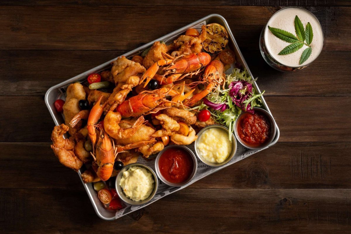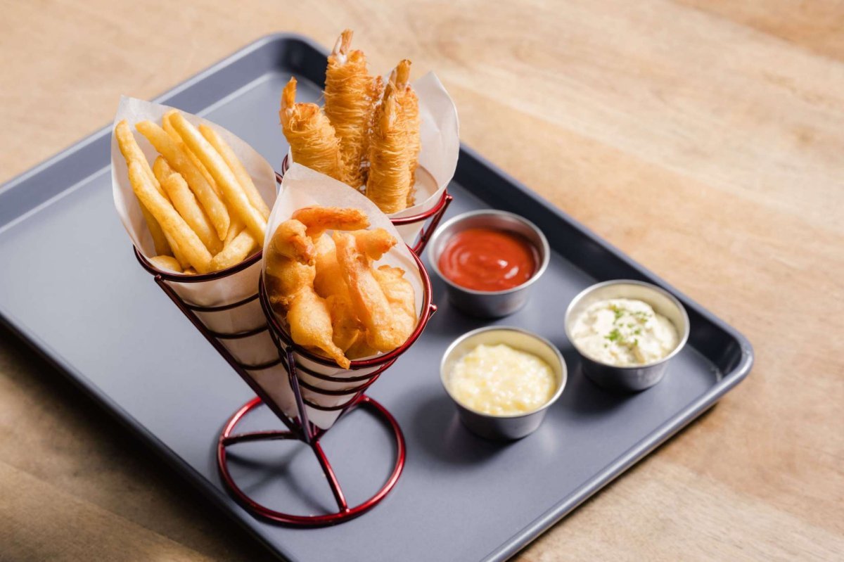 另個必點開胃菜再推「雙蝦總匯」,一個是裹上啤酒麵糊的脆炸蝦、一個是包裹台灣白麵線的脆麵蝦,雙重口感吃多也不會膩!為了搭配各種海鮮料理,主廚自特製四種特殊醬料,包括慢煮鮮番茄醬、自製塔塔醬、獨門辣根雞尾酒醬、椰林飄香醬,其中椰林飄香醬的靈感來自雞尾酒「Piña colada」,酸甜兼具的獨家風味是在其他地方吃不到的特色沾醬。