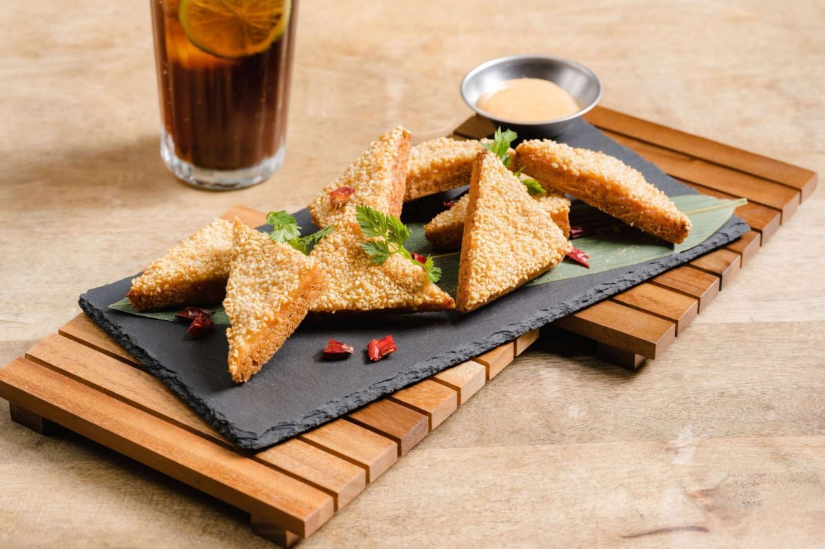 而The CAPE員工更是私推必點單品「芝麻蝦多士佐是拉差蛋黃醬」,外層裹滿白芝麻的酥脆全麥吐司包覆滿滿自磨蝦漿,配上泰式是拉差醬美乃滋,溫和的酸辣滋味及充滿層次的口感讓人欲罷不能。