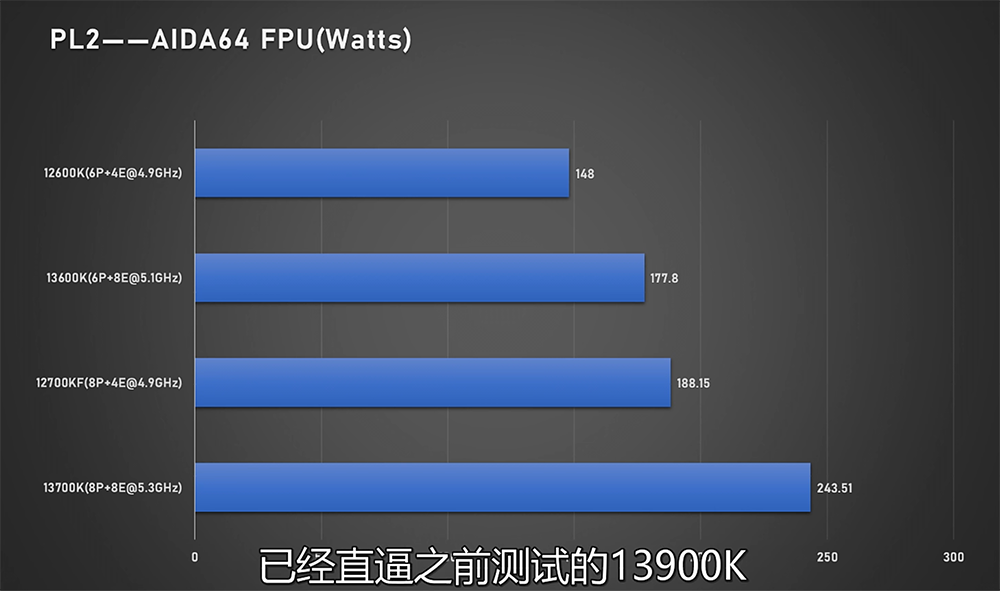 雖然效能提升不少,但功耗也相對增加一些,透過 AIDA64 FPU 測試,i7-13700K 上升到 243.51W,比目前 i7-12700K 的 188.15W 高出不少。i5-13600K 也達到 177.8W,比 i5-12600K 的 148W 還要高: