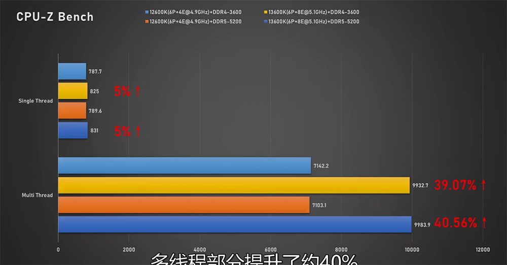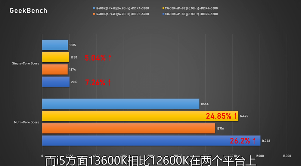 i5-13600K 單核心使用 DDR5 比較多,有著 7.26% 以上的提升,多核心也達到 26.2% 以上: