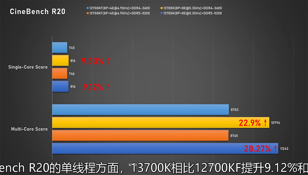 CineBench R20 部分,Core i7-13700K 單核心提升 9% 以上,多核心如果使用 DDR5,可來到 28.27%: