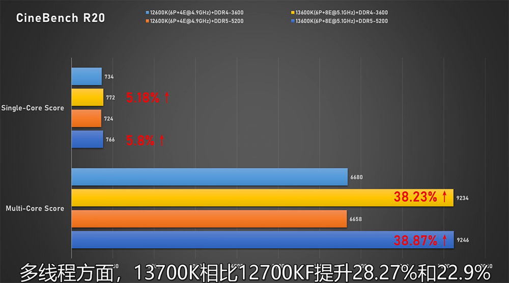 i5-13600K 單核心都有 5% 以上的提升,多核心也達到 38% 以上: