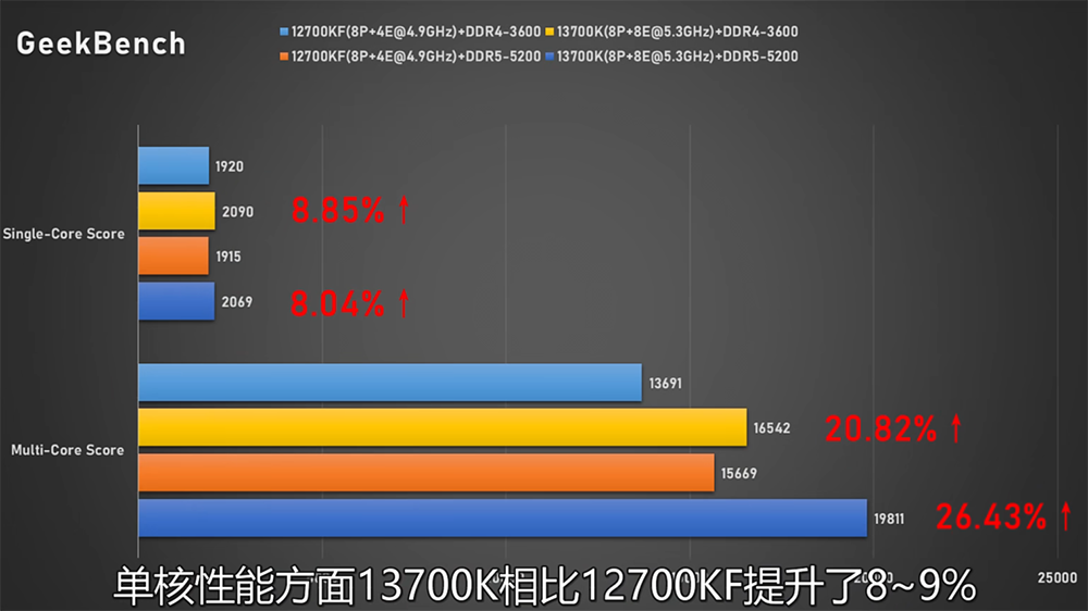Geekbench 表現也差不多,Core i7-13700K 單核心提升 8% 以上,多核心如果使用 DDR5,可來到 26.43%: