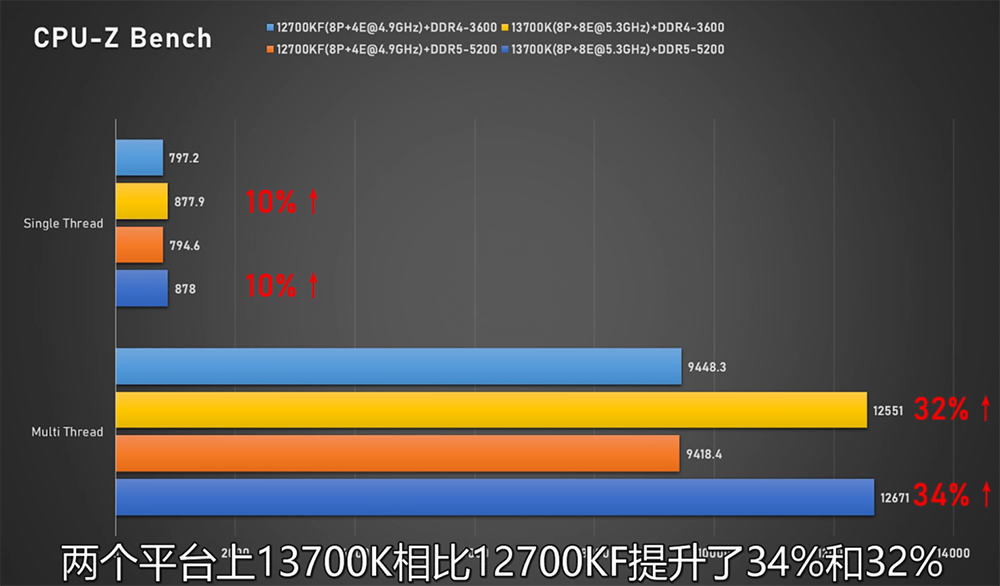 CPU-Z Bench 測試顯示,使用 DDR5 記憶體的話,Core i7-13700K 單核心提升 10%,多核心更達到 34%。DDR4 則是 10% 與 32% 的提升幅度:
