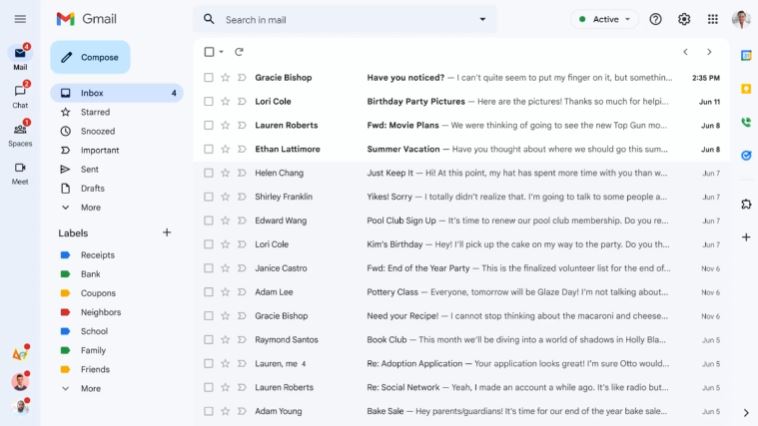 你可以在乾淨、簡化的介面中在應用之間切換,還可以根據最適合自己的應用進行自定。從「快速設定」(右上角頭像旁的小齒輪)則可以選擇要在視窗左側切換的應用,無論是 Gmail 本身,還是 Chat、Spaces 還是 Meet 的組合。如果你喜歡用標籤來做分類,你還將看到系統標籤(如已加星標、重要等)和你自己製作的自定義標籤單獨列出。喜歡聊天的人會看到附有傳入訊息片段的對話泡泡,以及快速回覆而不需打開完整訊息的選項。
