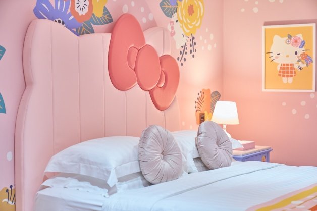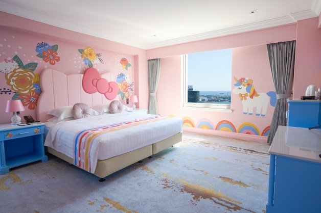 「Hello Kitty優雅巴黎」房型為「家庭套房」,採用「雙房雙床」,一次兼具市景和港景稀有的雙景觀,特別的是床頭板還是凱蒂貓的臉型,其櫻花粉布塊源自日本進口,牆面上發亮的彩虹裝置串接連通房設計,粉嫩到Kitty粉絕對會瘋掉!