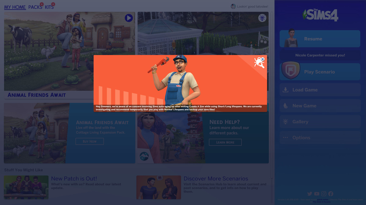 當玩家最近登入《模擬市民 4》時,也會看到一個關於這個 Bug 的跳出式說明,鼓勵玩家暫時不要使用「短壽命」或「長壽命」的設定遊玩。簡單說明一下,《模擬市民 4》擁有三種不同的壽命設定:長、普通、短,就如同名稱本身所暗示的,這個設定能夠決定遊戲角色在遊戲中「自然死亡」之前的存活長度,但無論選擇了哪種設定,玩家的模擬市民們依然有可能因意外身亡。