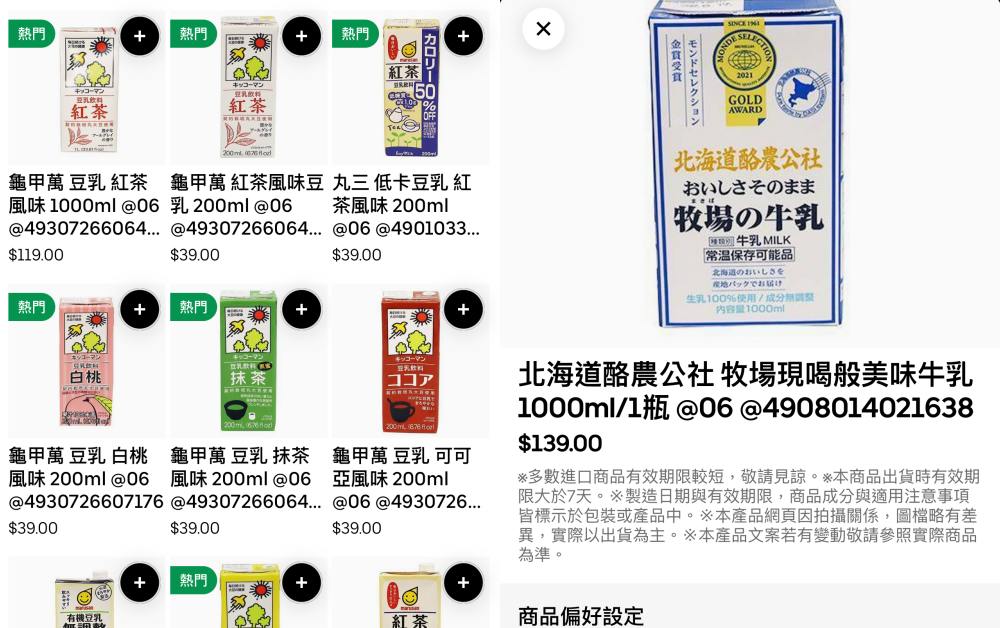 最後,想再喝點飲料也可以!大家最愛的北海道酪農公社推出「牧場現喝般美味牛乳」,在店內本來就是超夯人氣選手,在UberEats不只有賣1000ml版,還有推出小巧的250ml!口味超級齊全的「龜甲萬豆乳」所有口味全都有,不過儂編最愛還是紅茶、可可亞口味!