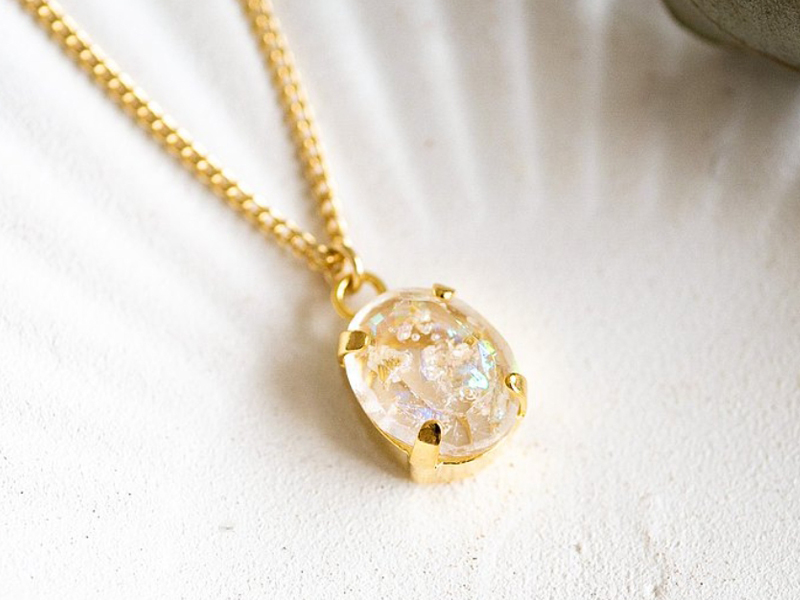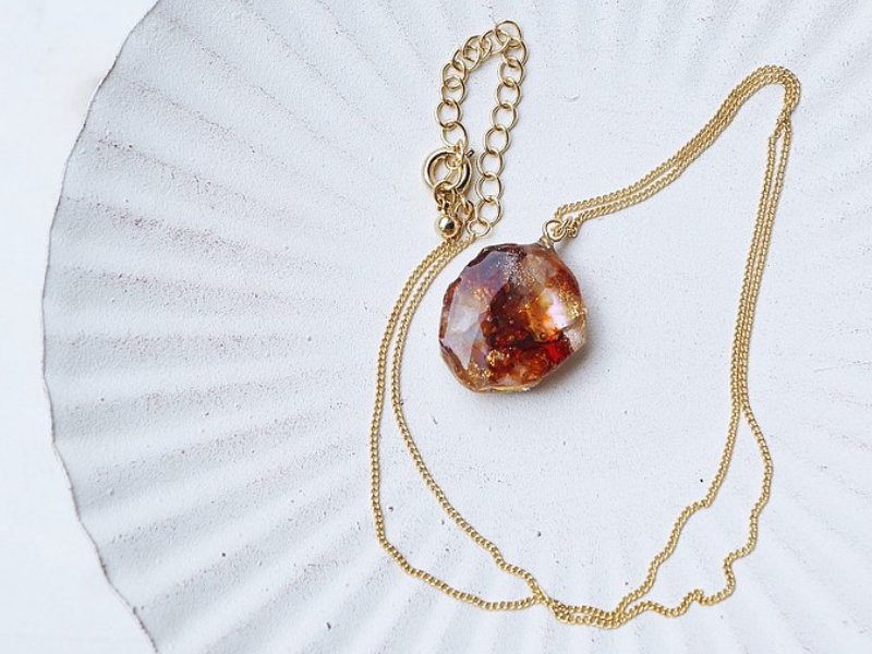 此款花朵項鍊由樹脂、乾花製成,通透感很精緻,戴起來的位置大約在鎖骨的地方。細節做得很好,超像一顆透明的小寶石,由樹脂材質製成也不容易破裂損壞。鏈條部分有兩種選項,鍍金項鍊、14kgf鏈條。