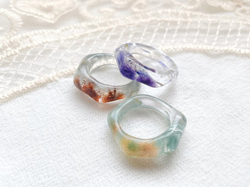 乾燥花樹脂戒指,看起來有點浪漫有點可愛!這款有三個顏色供挑選,不同手指頭可以配戴兩個不一樣顏色的樹脂戒指,視覺上層次感更豐富,讓人想要多看一眼!樹脂戒指輕透的果凍感,是超適合春夏季的飾品小配件呢!