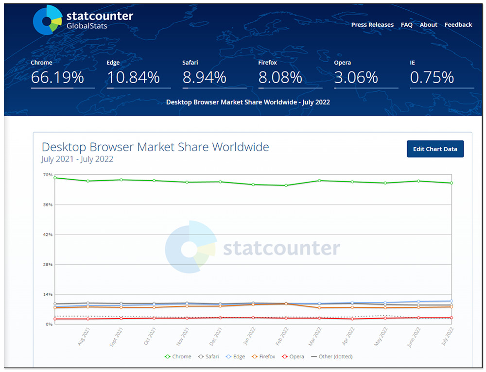 此外,隨著微軟放棄 Internet Explorer,專注在提升 Mircrosoft Edge 瀏覽器的使用體驗,幾天前 Statcounter 最新數據指出, Mircrosoft Edge 瀏覽器市佔率有慢慢提升,2022 年 6 月達到了 10.64%,跟 Google Chrome 瀏覽器的 66.93% 相比還有一段差距,但至少確實有增加,而且已經是第二名,第三名為 Safari,接著是 Firefox、Opera,IE 只剩下 0.75%: