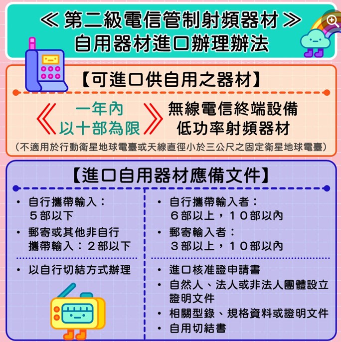 NCC針對第二級電信管制射頻器材自用需求訂有【自用器材進口辦法】,可透過「以自行切結方式辦理」與「需要辦理進口核准證」,在一定數量內合法進口供自用。依據電信管制射頻器材管理辦法第18條規定,除衛星行動地球電臺及衛星小型地球電臺外,自行攜帶進口供自用之無線電信終端設備(例如含WIFI、藍牙功能之電器產品)在5部以內者,免向國家通訊傳播委員會(NCC)申請電信管制射頻器材進口許可證。6部以上、10部以內者,應檢附相關文件向NCC申請電信管制射頻器材進口許可證。