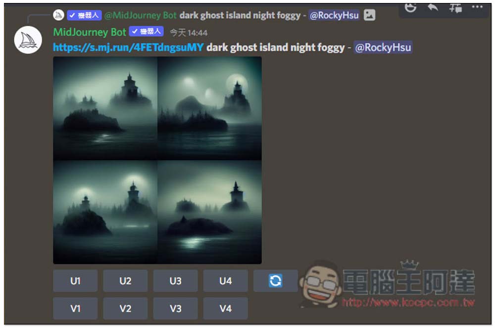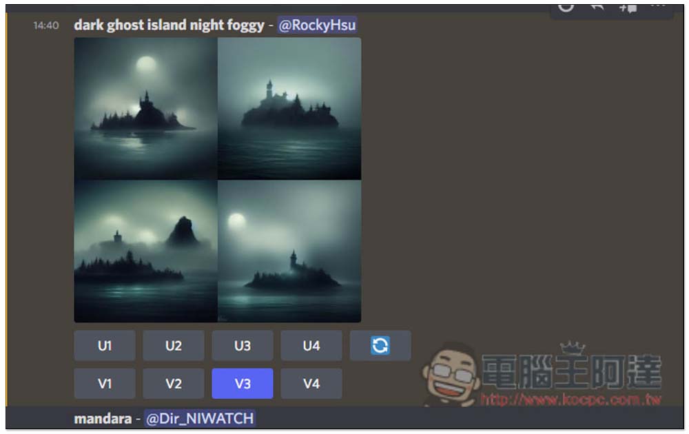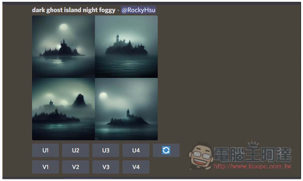 像這樣,每次出來都會有四張圖片,下方還有 U1、U2、U3、U4 以及 V1、V2、V3、V4 功能,數字部分,左上為 1、右上為 2、左下為 3、右下為 4。U 是 Upscale 的縮寫,當你滿意這張圖片時,就可以用這功能取得大圖片,V 是 Variation 的縮寫,會根據這張圖片再繼續下去延伸變化。最右邊圖示則是重新運算: