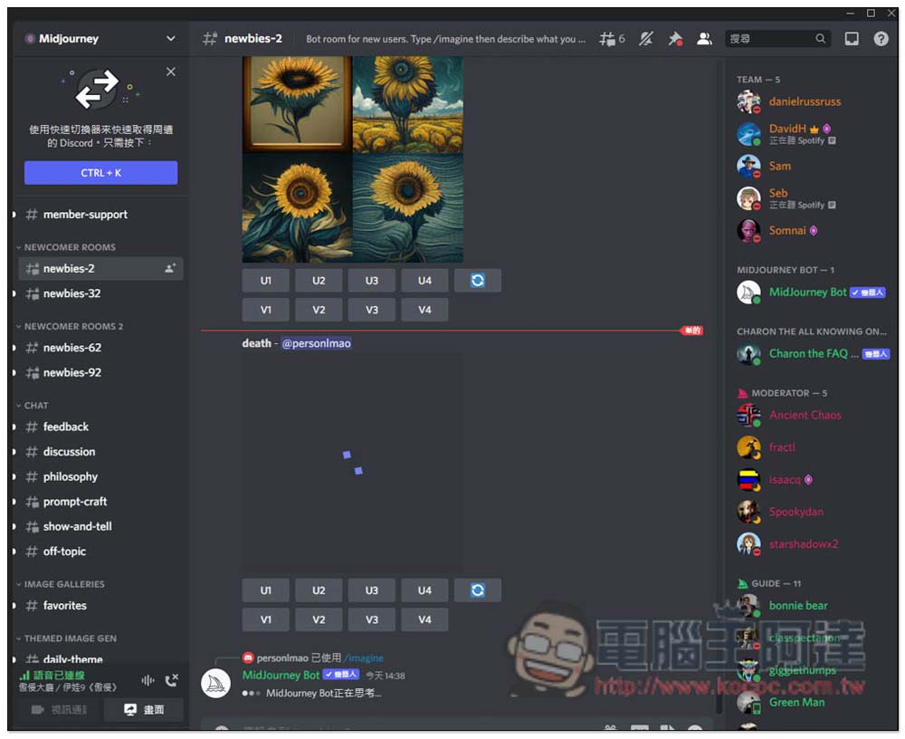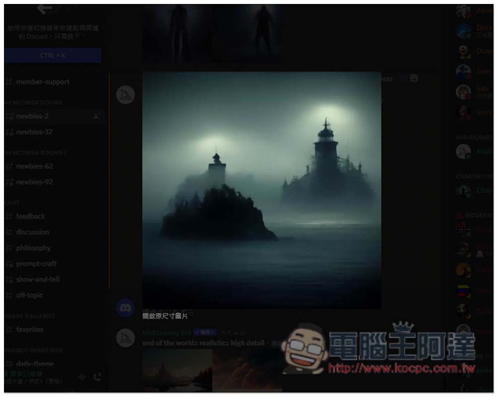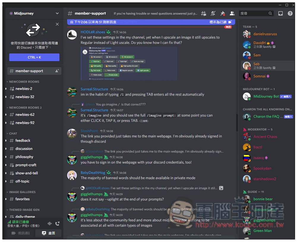 接著就會進到 Midjourney 的 Discord 頻道裡面,目前裡面有很多成員,因此常常會有訊息。有任何使用上的問題,可在 member-support 裡面發問,而要 AI 自動運算圖片的話,請進入 newbies 系列的聊天頻道,任何一個都可以: