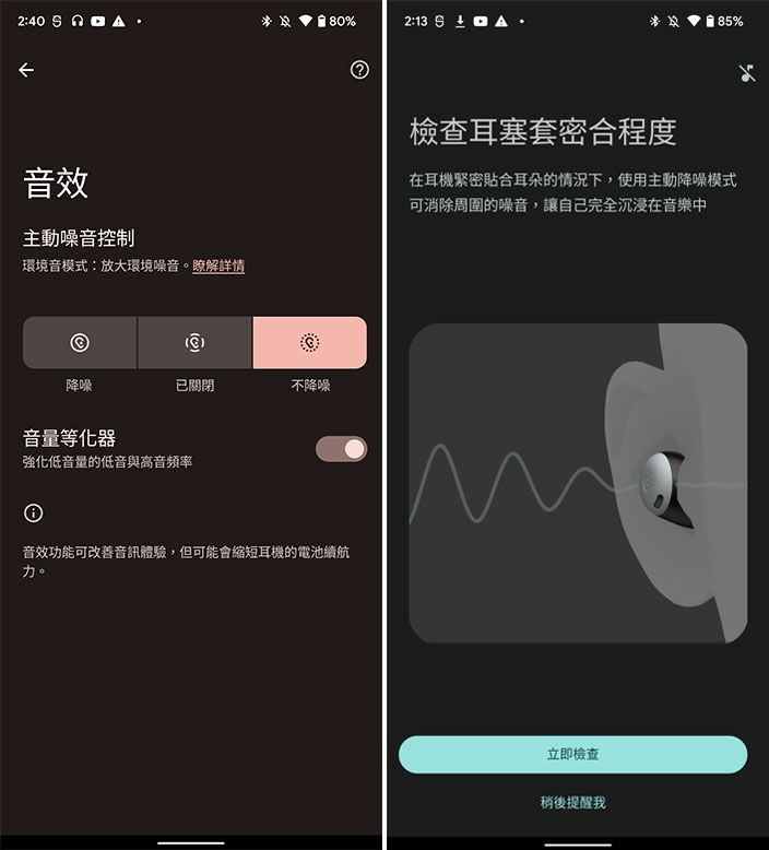 之所以沒有在一開始收到就火速寫開箱,原因在於耳機這類重視聽覺感受的產品,筆者還是希望能夠多點時間實際親身聆聽各種類型音樂,再來與大家分享聽起來的心得感想。在 Pixel Buds Pro 裡面雖然有音量等化器,不過就跟 Pixel Buds A 一樣,應用程式裡面只有一個簡單的開關,不能自訂等化器中的每個細節,這就失去很多自訂喜好的彈性空間,不過 Google 此前也承諾過在今年稍晚會推出更新,為沉浸式電影環繞音效添加更無整的等化器與空間音訊。 Pixel Buds Pro 僅支援 AAC 和 SBC 的藍牙編解碼器,不支援 LDAC 或高通的 aptX 編解碼器,對於耳機發燒友來說可能會感到失望。