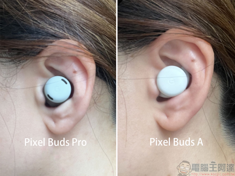 Pixel Buds Pro 的耳塞形狀與 Pixel Buds A 相比,尺寸略大一點點,不過戴起來是舒服的。少了固定於耳朵上的鰭片,這點有好有壞。Pixel Buds Pro 其實有四種顏色,差異在耳塞觸控面板上,但是在台灣只有賣迷霧灰與石墨黑兩種,讓原本很期待彩色的我有點小小失望就是了。
