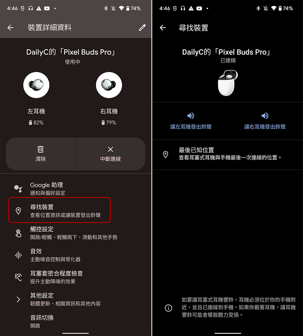 耳機因為身形小,忽然找不到似乎是很容易發生的事情。就像我們在家找不到手機,會撥打後讓其發出聲響聽音辨位,尋找裝置功能可以呼叫耳機發出音效,且哪邊找不到就呼叫哪邊,讓你更容易找到不知丟哪去的耳塞。另外,如果你是整組不知丟哪,還可以查看最後的連線位置,給你一個找到它的大方向,這點在外出時特別方便。