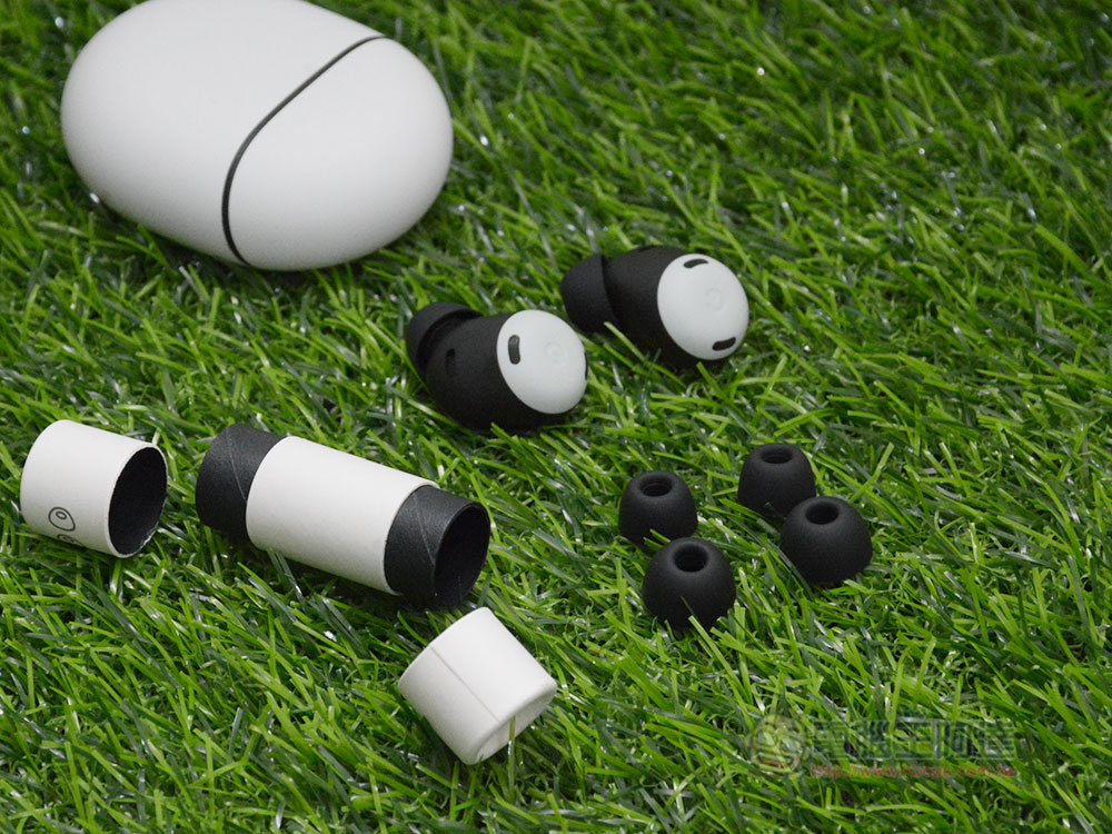 Pixel Buds Pro 的內盒中的組成非常簡單,除了充電盒與耳機本體外,就是一個放置另外兩種不同尺寸矽膠耳塞套的小紙筒,你可以依照自己的喜好選換不同鬆緊程度的款式。畢竟這款藍牙耳機本身具備有降噪能力,選擇最服貼的尺寸才能達到最佳效果,也更能保持配戴的舒適度與穩定性。