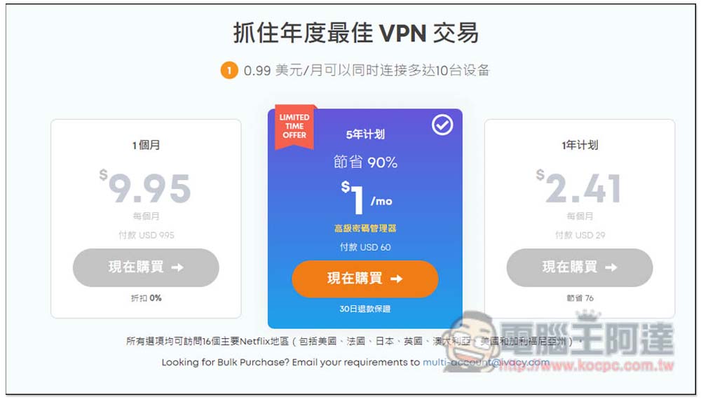 Ivacy 共有三種方案,1 個月、1 年與 5 年,我們最推薦 5 年,這是這幾年以來,Ivacy 推出過最便宜的價格,只需要 1 美金,而且現在還會在另外送專業密碼管理工具(免費使用 1 年),可以讓你管理所有申請過的帳號與密碼。