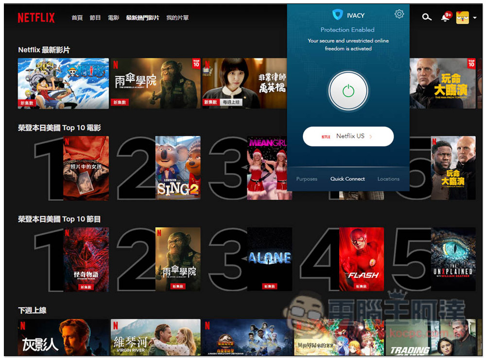 這也是很多人買 Ivacy VPN 的原因之一,而且不只是 Netflix,連 Disney+、YouTube 等都可以。未來當你碰到任何網路影音服務、遊戲,有限制某個國家,就能嘗試用 Ivacy 來解決(VPN 到那個國家)。