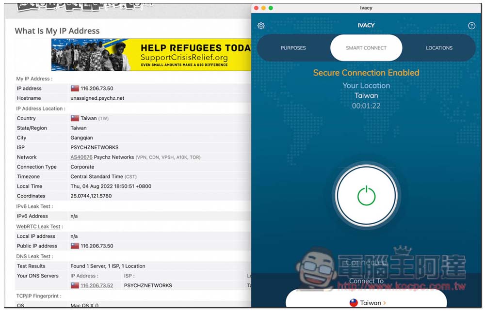 我也實測過,Ivacy 的 IP、DNS、WebRTC 都沒有洩漏問題,我連線到台灣伺服器後,所有都是顯示台灣 IP: