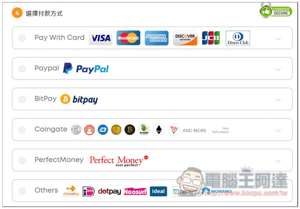付款方式有信用卡、PayPal、bitpay、以及其他支付,還蠻多元的:
