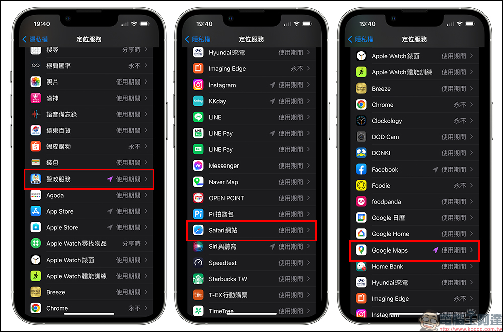 首次使用時,務必將手機的定位服務開啟。以 iOS 為例,須將「警政服務」、「Safari 網站」、「Google Maps」設為允許(建議可設為「使用期間」即可)。
