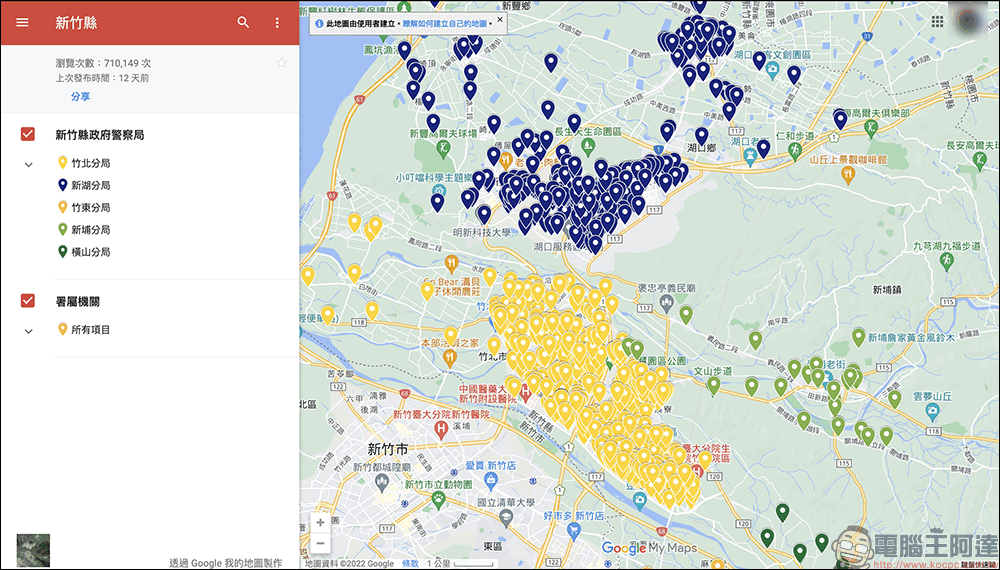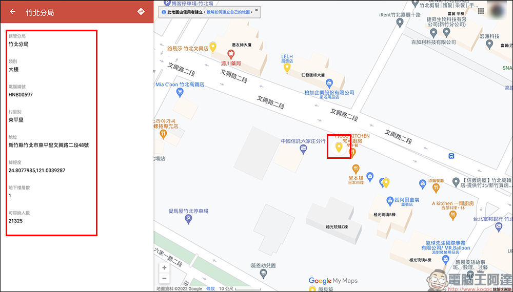 開啟政府為民眾整理的全國各地區防空避難處所地圖後,先允許瀏覽器使用定位功能就可以看到 Google 地圖上的許多防空避難處所標記點(各位能點選就近所在地的地點),接著就能看到該地點的轄管分局、地點類別(力:大樓)、電腦編號、村里別、地址、經緯度、地下樓層數、預估可容納人數。