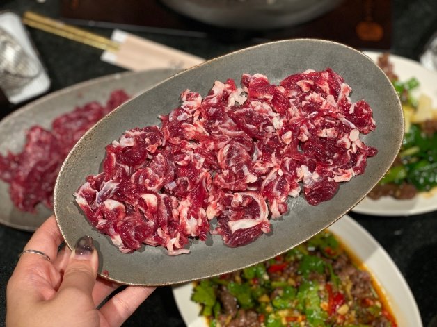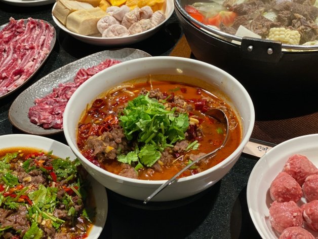 溫體牛肉的部分首推老饕必吃的「頂級上選溫體牛肉」,若想吃脂肪量較少的話可以選「溫體赤身牛肉」,另外還有口感軟嫩的肩胛和脊椎等,亦提供綜合牛雜(牛肝、牛百葉、牛心)、燉肉三兄弟(嘴巴肉、鳳尾筋、骨邊肉)等,湯底滾後下鍋3至5秒即可!