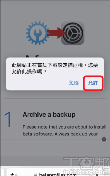 步驟 4.於出現此面畫時,按下「允許」下載 iOS 16 Beta Profile 描述檔。