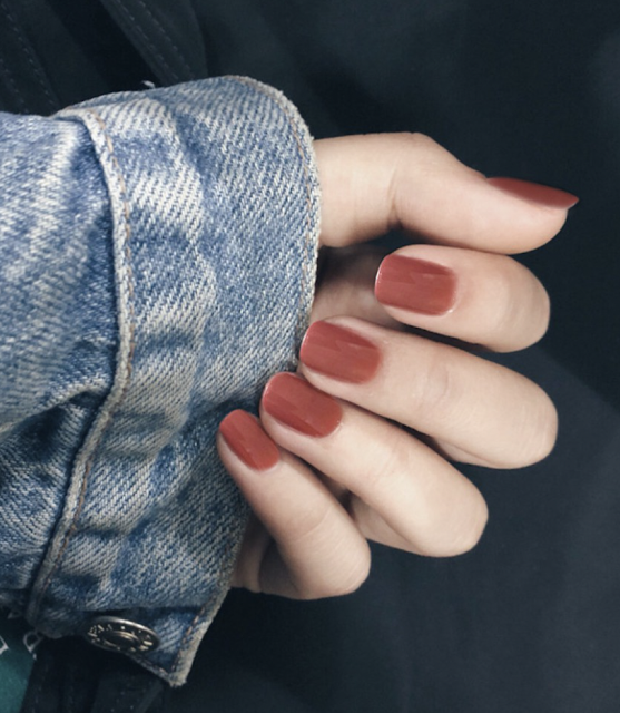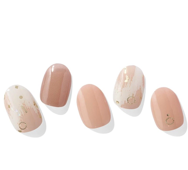 清新透明感的柔軟棕色指甲貼是品牌的熱銷款式,輕盈融化的大理石光澤感貝殼粉,散發出優雅的俏皮感,非常適合輕鬆氣氛的假日時尚。