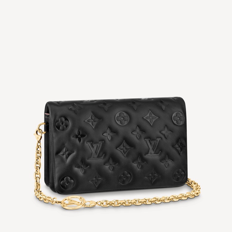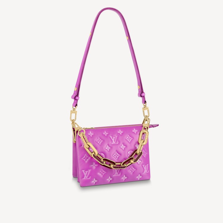 「Coussin」這款包在 2021 年春夏 Louis Vuitton 春夏繡上初次問世,該包款名字取自法文的 “墊子”,在包款的外型上便以極為細緻的小羊皮為材料,並在內裡加入襯墊製造出澎潤的質地,而最具代表性的 monogram 則是透過壓印的方式呈現,值得注意的細節在於品牌使用的金屬鏈帶,它除了可以是當作腋下的背帶使用外,如果僅單揹皮革或是織帶背帶的話,其鏈條可作為裝飾使用,拆卸下來後,鏈條上的 monogram 刻紋更可以當成腰鏈做服裝上的搭配。