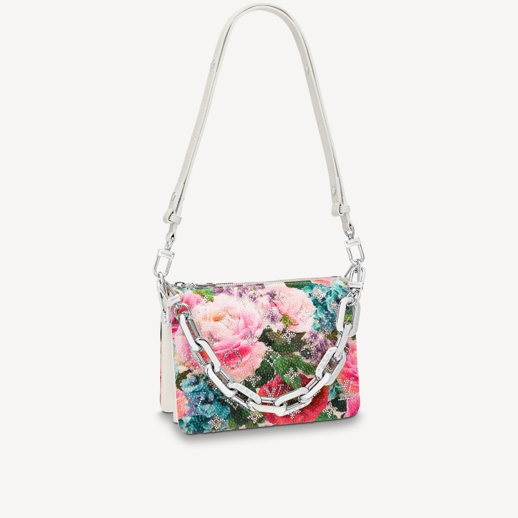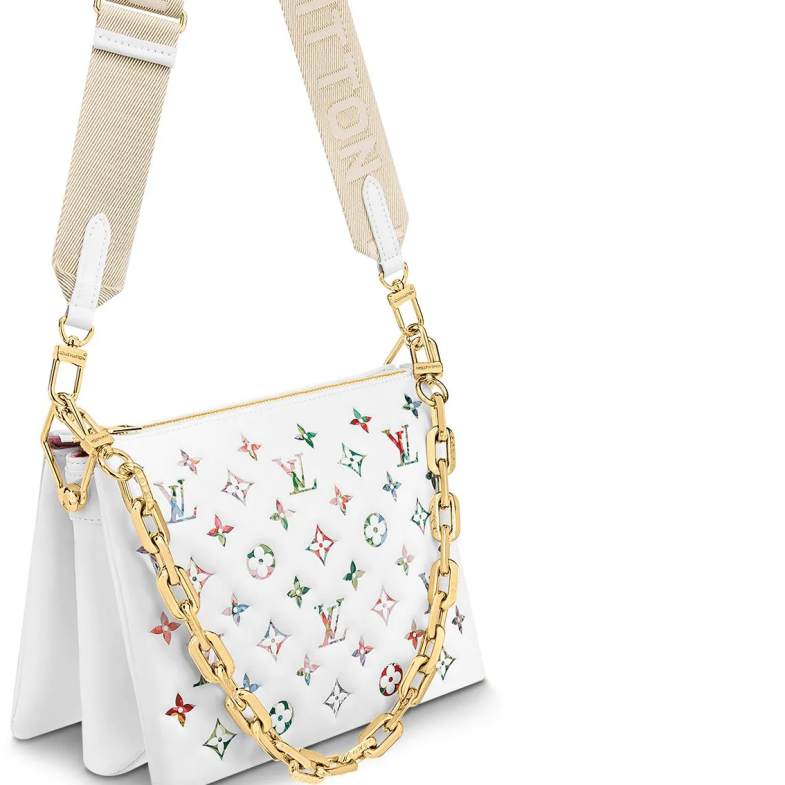 該包款一上市後,因獨具風格的外型,加上可多種揹法的設計,讓「Coussin」一問世就擁有一票粉絲,無疑已成為 Louis Vuitton 的中的經典款,時隔一年的時間,「Coussin」在今年又做出了許多變化,在背帶上不僅換上了寬織帶,包身上更透過印花的技巧在 monogram 中藏入了印花,讓一款包宛如絲巾般擁有斑斕的色彩。