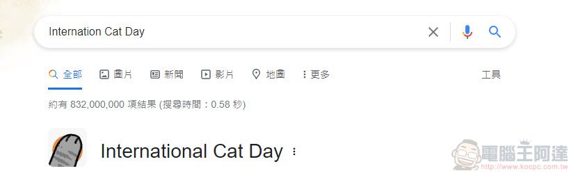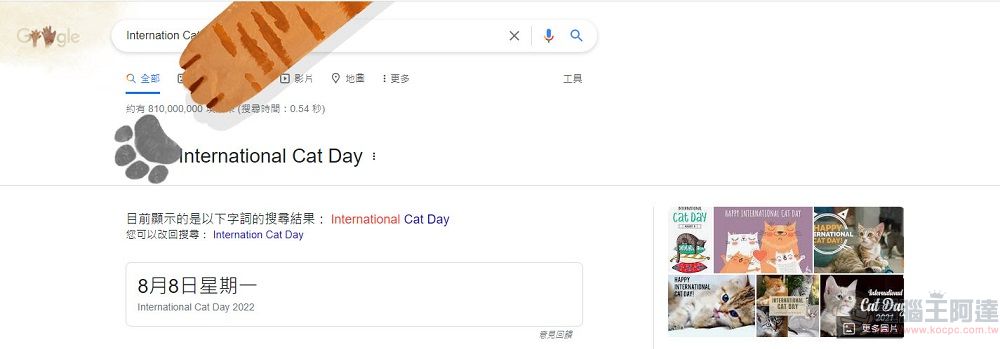 對於國際貓節日,Google 搜尋也特別設計了主題彩蛋,只要在Google 搜尋輸入「國際貓節日」或「International Cat Day」,就能在 Google 搜尋結果頁面,左側或右側找到橘黃底的貓爪圖案。