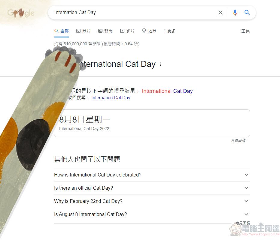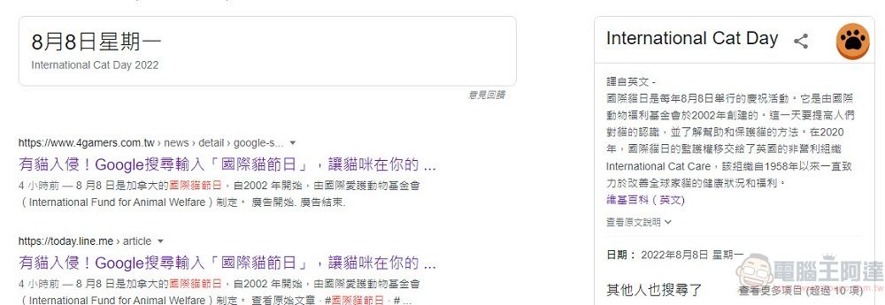 今天8月8日應該大部分台灣人都立馬聯想到是父親節,不過你可能不知道的是,國際上今天其實是國際愛護動物基金會設立的「國際貓節日(International Cat Day)」,Google 搜尋還特別為此加入貓咪彩蛋,只要輸入「國際貓節日」或「International Cat Day」,就會有動畫跟音效兼具的貓咪彩蛋。